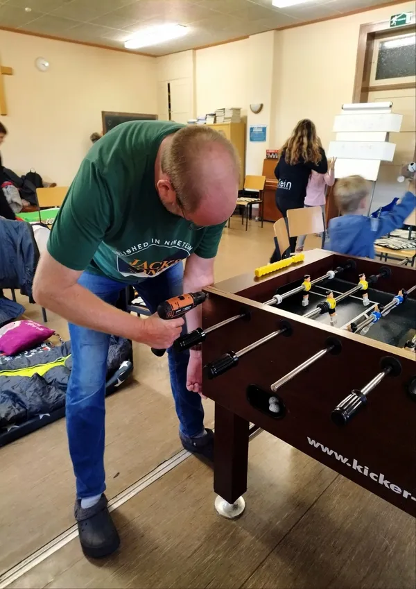 Da unser Tischkicker den Herausforderungen des Kirchenjugendlebens nicht mehr gewachsen war, musste unser Pfarrer höchstpersönlich Hand anlegen.