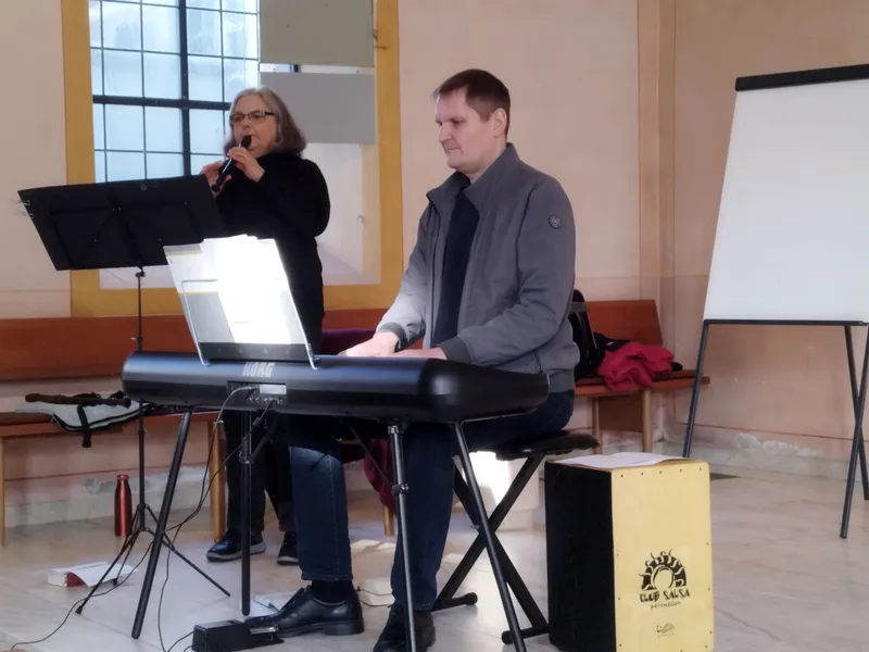 uns auf Piano und Flöte durch den Gottesdienst begleitet, und ihn so auch musikalisch,