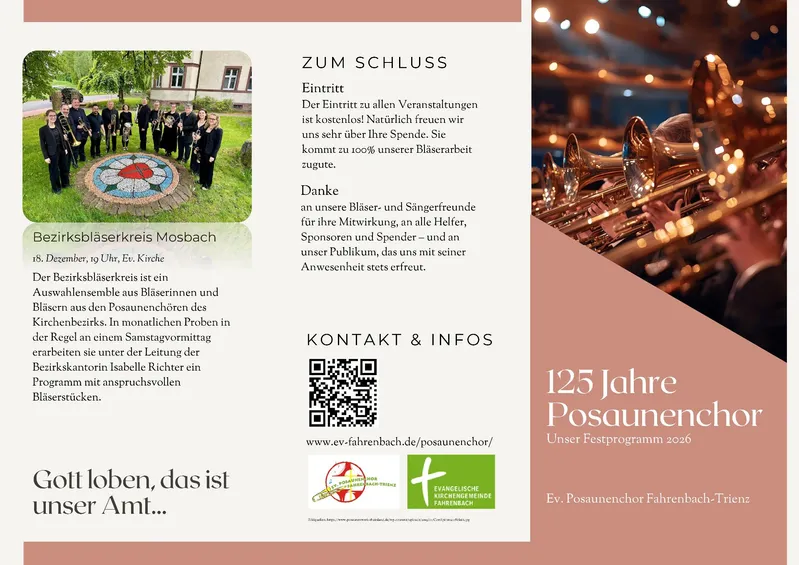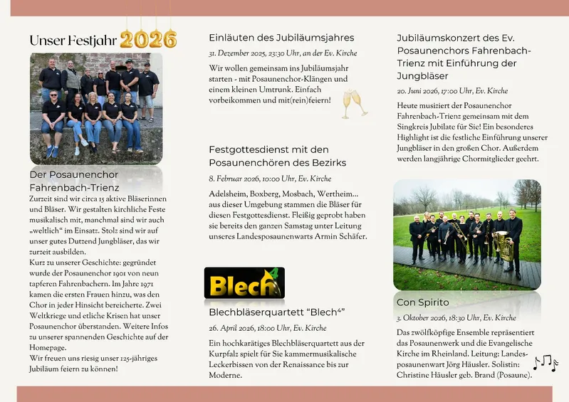 Wer jetzt garnicht mehr genung von Posaunenmusik bekommen kann, dem möchte ich gerne das Programm zum Jubiläumsjahr unseres Posaunenchors ans Herz legen.