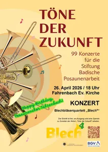 (AS) Das Blechbläserquartett "Blech⁴" freut sich, vom Posaunenchor Fahrenbach zu seinem 125. (!) Geburtstag eingeladen worden zu sein, und wird sein Bestes geben, diesem würdigen Anlass gerecht zu werden. ?
